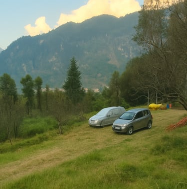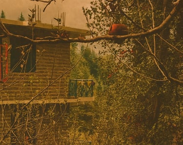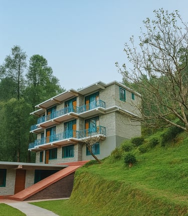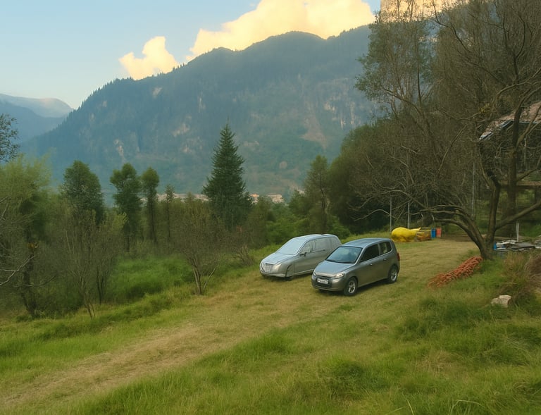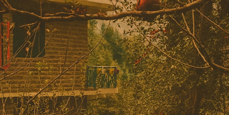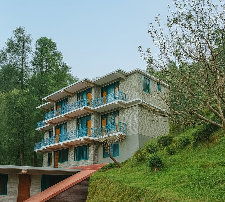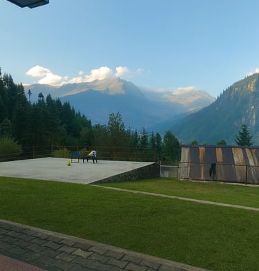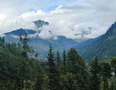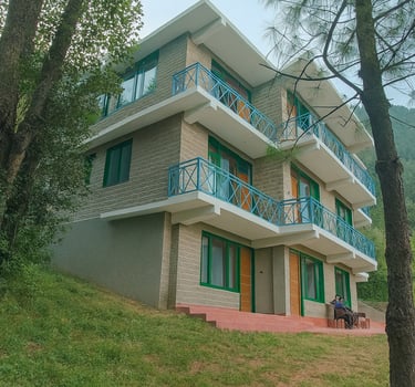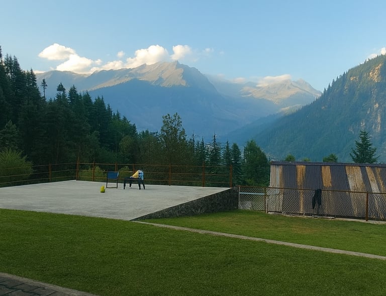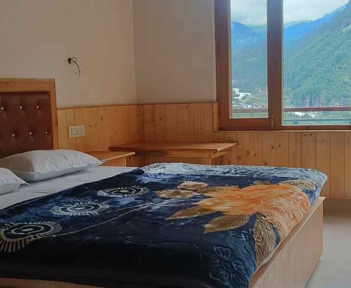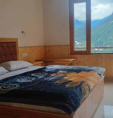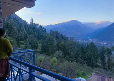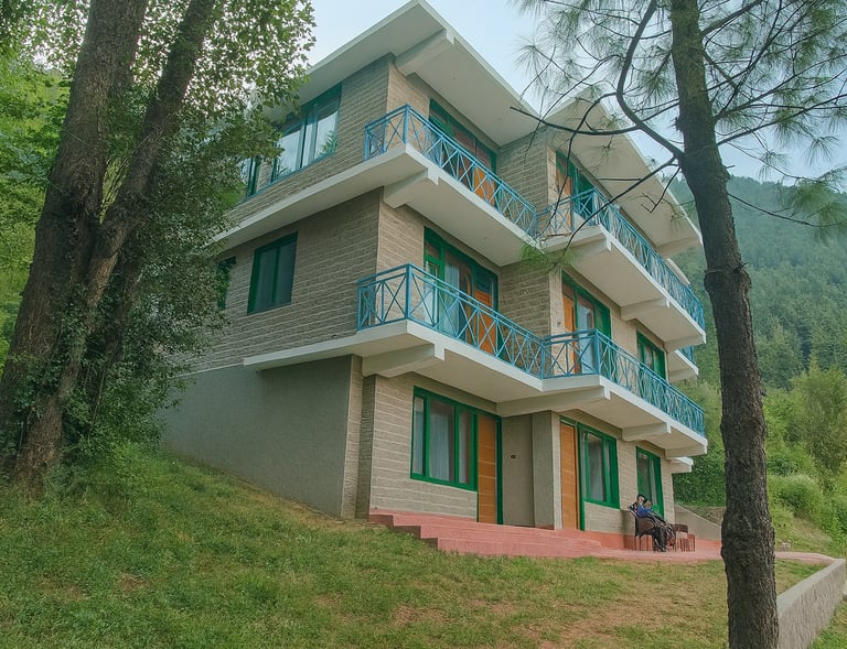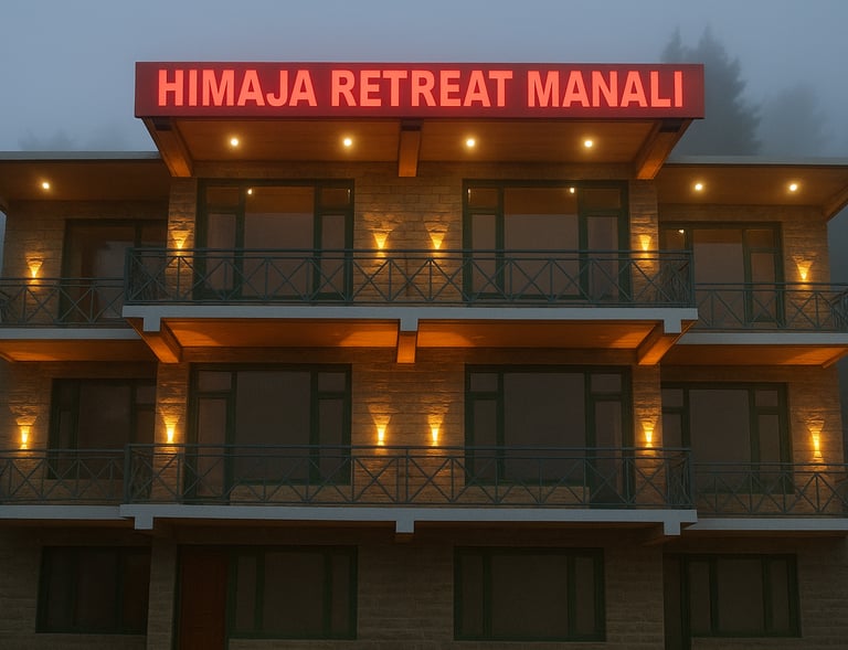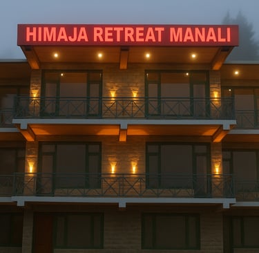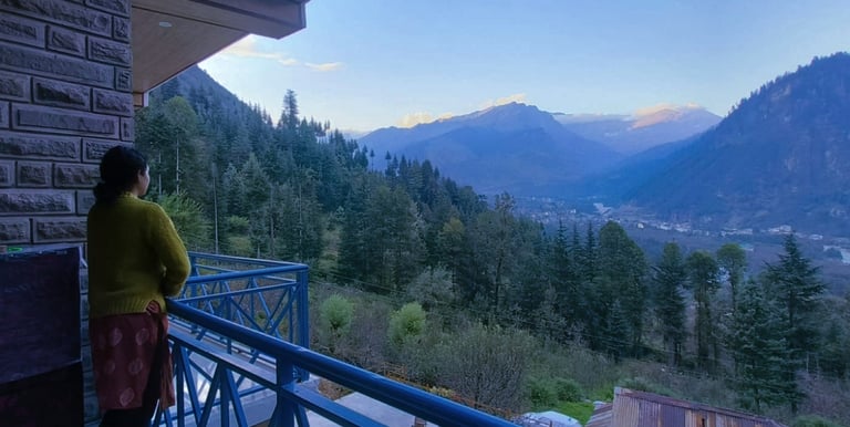 Himaja Retreat – your forest hideaway with a private waterfall, breathtaking views of Jogini Falls and Rohtang Pass, and cozy interiors made for every season.